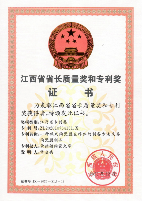 校园网讯 近日,江西省质量大会在南昌召开,省长叶建春出席大会并为2025年度省长质量奖和专利奖获奖单位和个人颁奖。我校常启兵教授的专利《一种碟式陶瓷膜支撑体的制备方法及其陶瓷膜制品》荣获“江西省专利奖”,梁健正高级工程师的专利《一种原位生成莫来石晶须增强陶瓷坯体及其制备方法》荣获 “江西省专利转化运用奖”!我校是江西省唯一同时获得专利奖和专利转化运用奖的高校,充分展现了学校在科研创新与成果转化领域的实践成果。